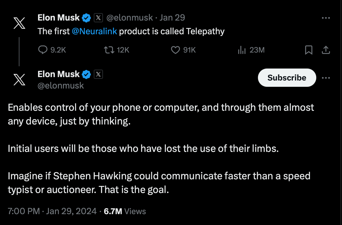 Big news in the brain computer interface (BCI) world: Elon Musk’s Neuralink announced it implanted its device in a first human patient. Musk detailed early goals for Neuralink on X: