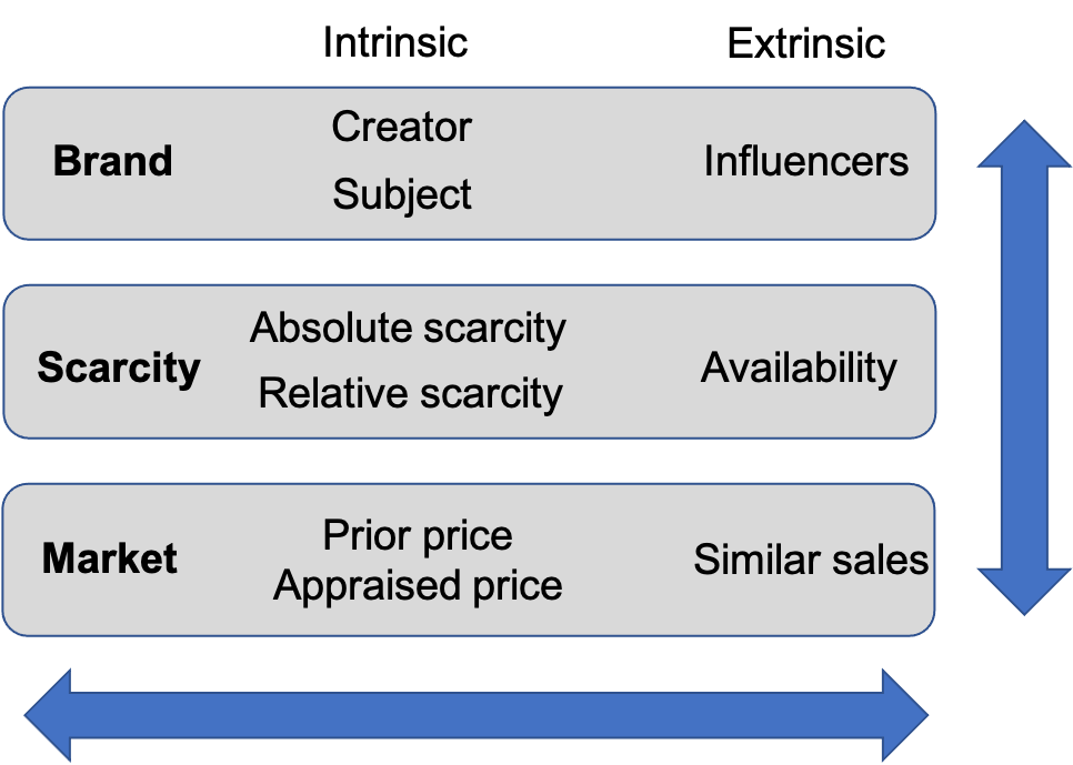 Brand, scarcity, and market are the elements that build consensus around the value of any given collectible. Brand creates value, scarcity enhances value, and markets establish price in a virtuous cycle that results in the desirability of any given collectible. Within this virtuous cycle, there are intrinsic and extrinsic factors that make up brand, scarcity, and market that flow like this: