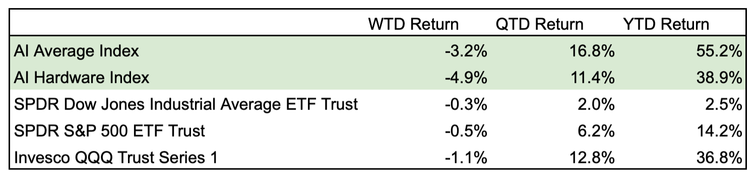I track the performance of two AI indices: the AI Average Index (AIAI) and AI Hardware Index (AIHI). The indices track a selection of relevant publicly traded AI companies to represent how investors are viewing the AI opportunity.