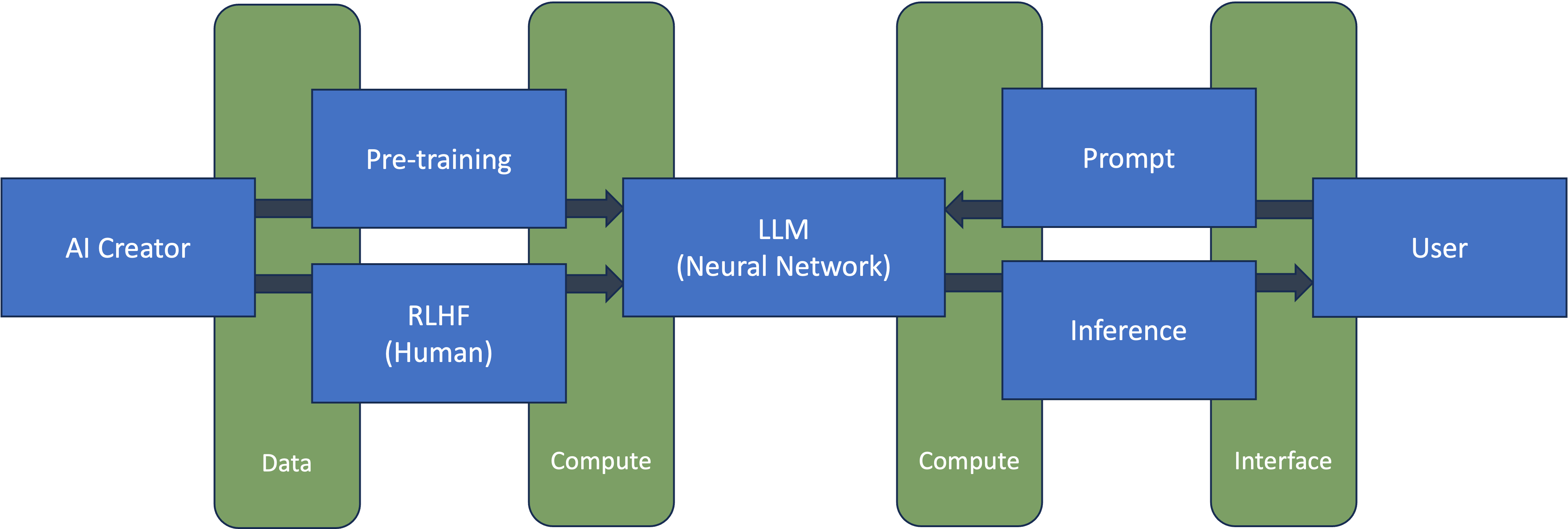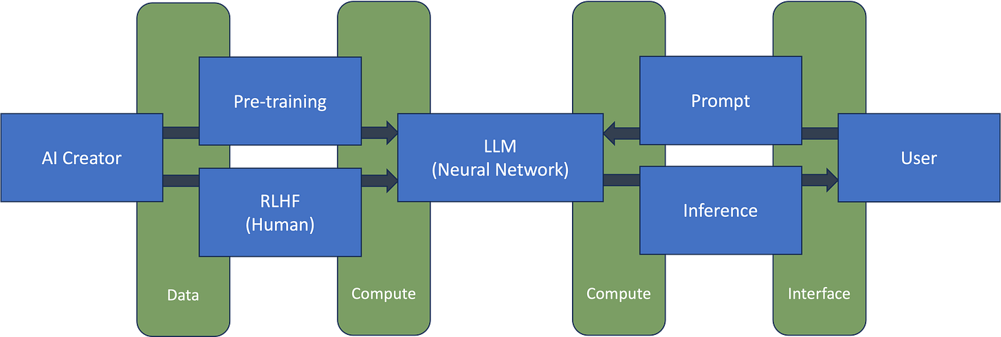 Our definition of an LLM — a neural network that is trained to infer what words should come next in a sequence based on some prompt — fits into my mental model for investing in AI via the major categories of compute, data, and inference.