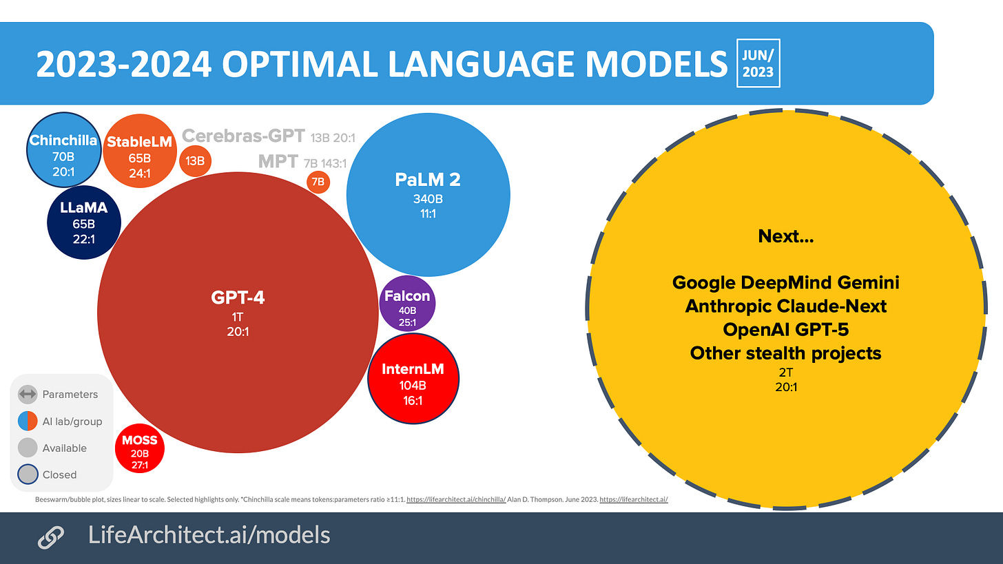 LLMs are often sized by the number of parameters in the model. More parameters suggest a more complex model. OpenAI’s GPT-4 reportedly has one trillion parameters vs 170 billion parameters in GPT-3. Google’s PaLM2 is trained on 340 billion parameters.